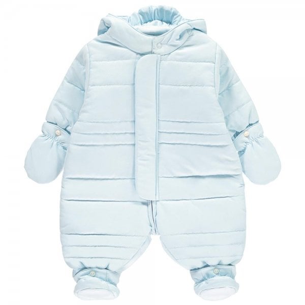 Emile et Rose baby boy's pale blue microfibre snowsuit with co-ordinating detachable mitts and bootees. Perfect to keep baby warm in the winter months.